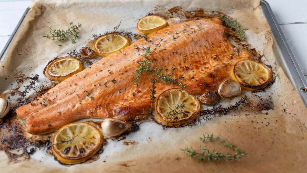 - Place the salmon fillets on a baking tray. Coat with coconut oil.